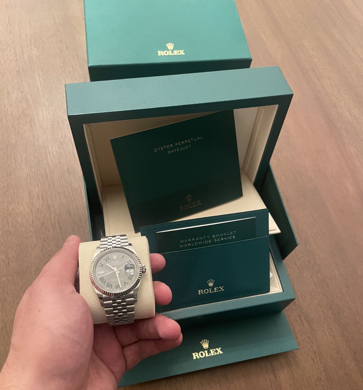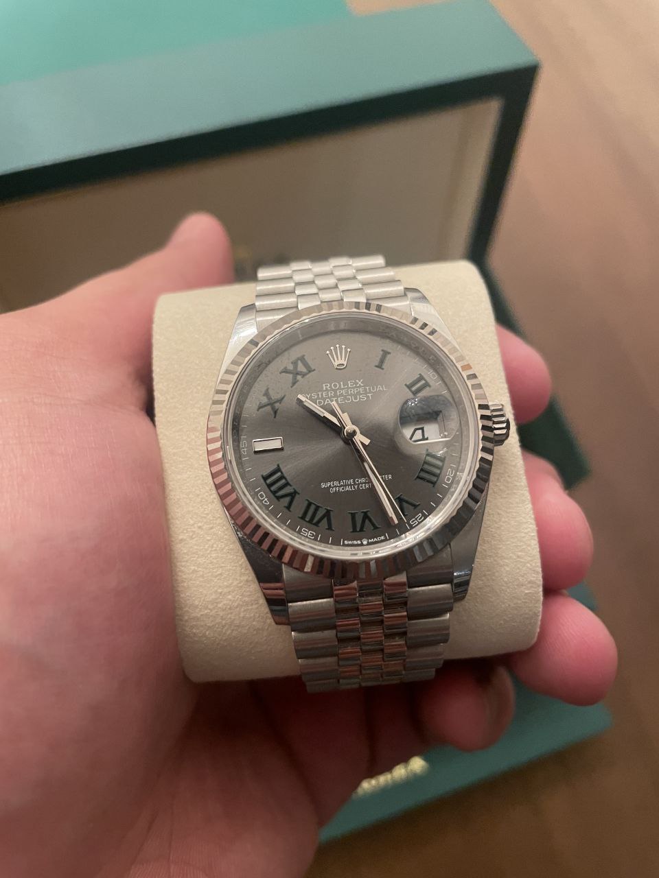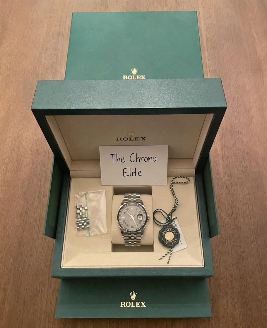 The Rolex Datejust 126234 glows with its slate sunray finish. Green Roman markers stand out sharply. Diamonds add elegant sparkle without overwhelming the classic Wimbledon look. The 36mm Wimbledon diamond dial Datejust wears beautifully on smaller wrists. Sized to 6.5 cm wrist, it fits comfortably and looks refined. Powered by the Caliber 3235 movement, this Rolex Datejust 36mm Jubilee delivers top accuracy. It holds a 70-hour power reserve. The Parachrom hairspring resists magnets well. Chromalight hands and markers provide bright blue glow in low light. Water resistance reaches 100 meters with the Twinlock crown.