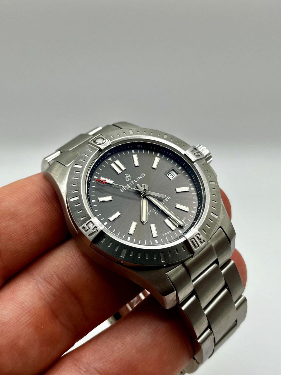 This near-mint Breitling Chronomat A17313 grey dial 41mm steel combines Breitling’s aviation legacy with modern performance and exceptional condition. Active long warranty, full set provenance, and barely worn status make it an outstanding opportunity. Collectors prize this reference for its durability, COSC certification, and strong value retention. We guarantee 100% authenticity through expert inspection.