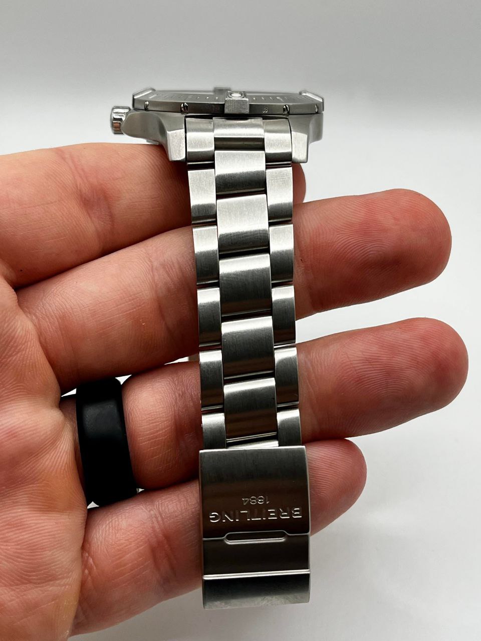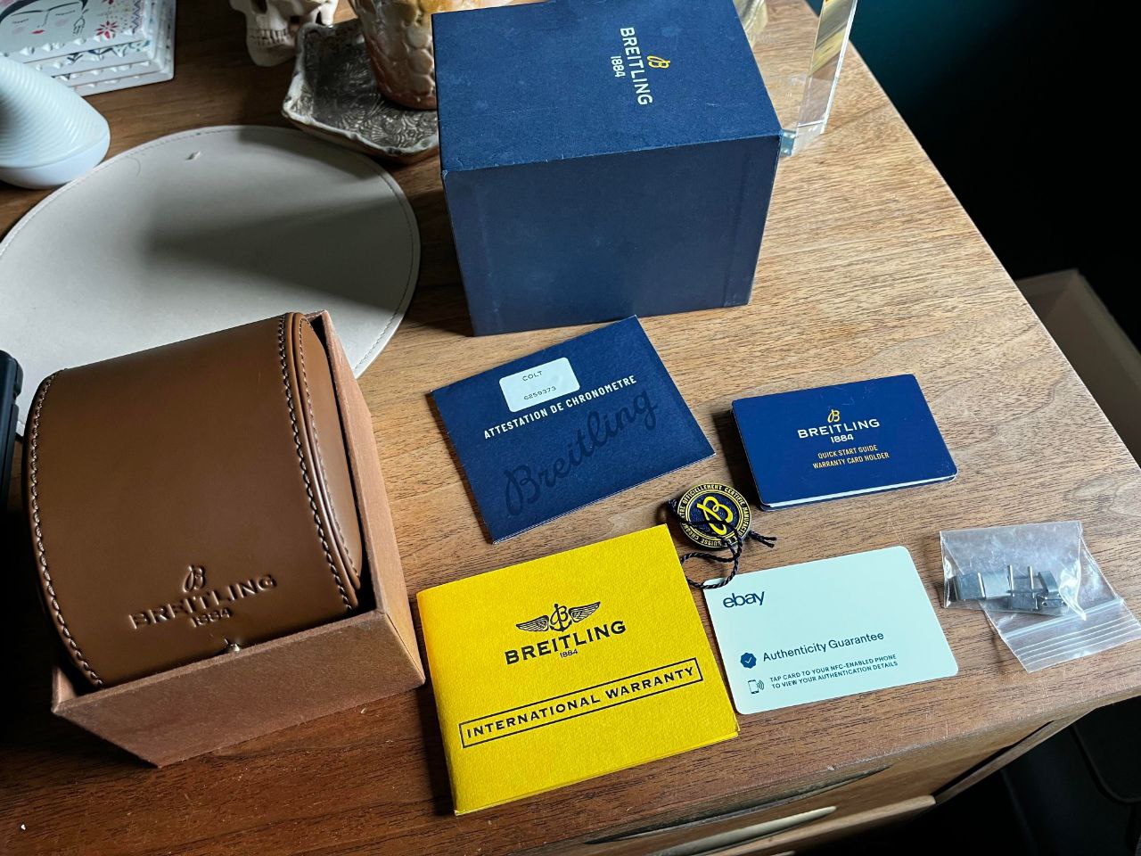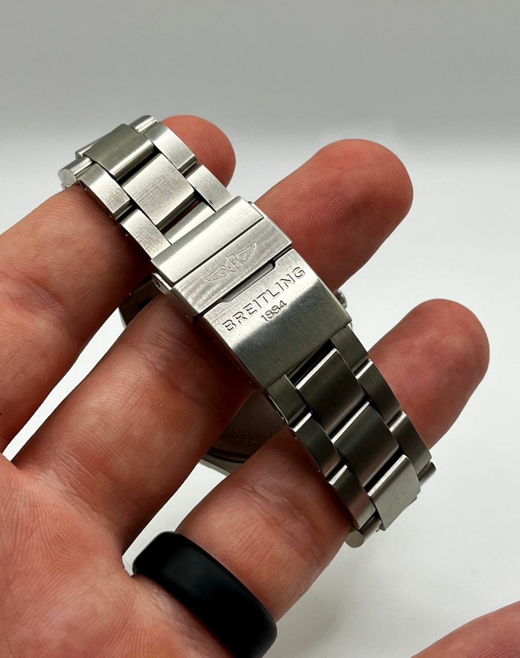 Ref A17313 from recent production. Comes as full kit with active Breitling warranty through November 2027. Owned previously, sold a year ago, repurchased brand new, worn only a handful of times. Absolutely no issues — runs great, bezel alignment is perfect, 99% condition. No scratches, dents, bracelet stretch, or heavy wear. Case, bezel, crystal, and dial remain pristine. Fully linked Rouleaux bracelet is unsized and flawless. Includes inner/outer boxes, warranty card, hang tags, manuals, booklet, card holder, and all original accessories as issued.