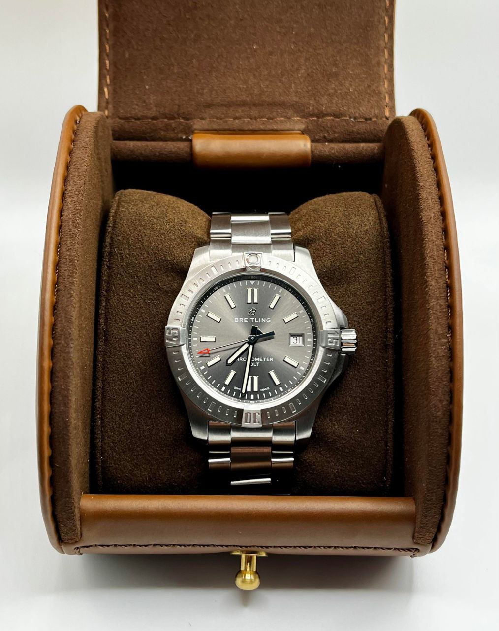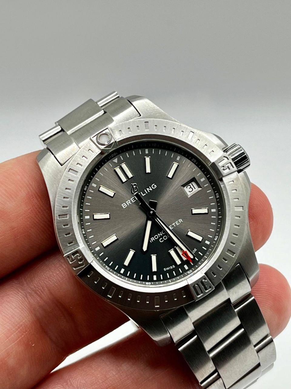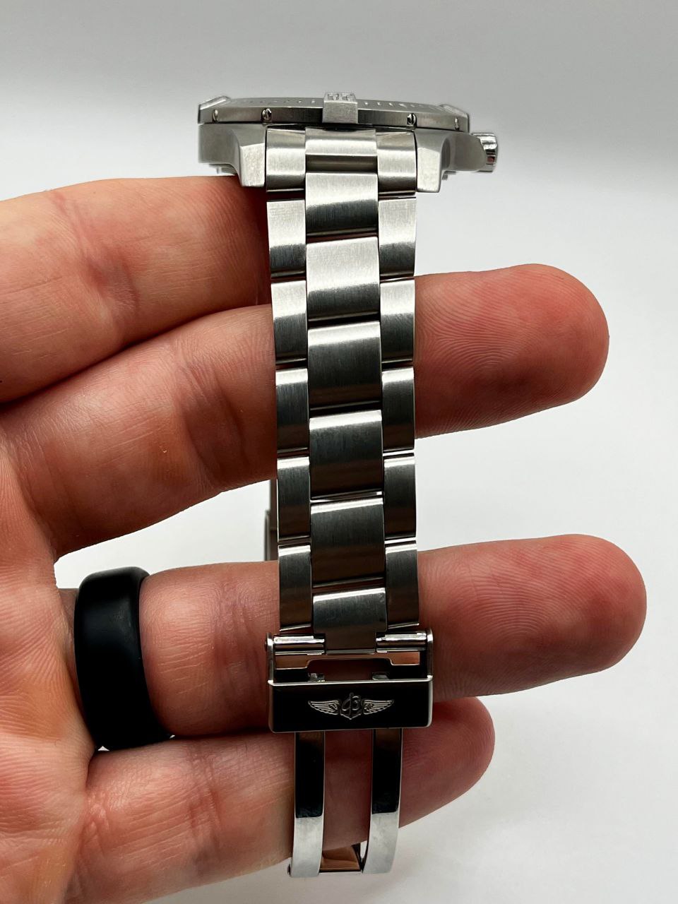 Ref A17313 from recent production. Comes as full kit with active Breitling warranty through November 2027. Owned previously, sold a year ago, repurchased brand new, worn only a handful of times. Absolutely no issues — runs great, bezel alignment is perfect, 99% condition. No scratches, dents, bracelet stretch, or heavy wear. Case, bezel, crystal, and dial remain pristine. Fully linked Rouleaux bracelet is unsized and flawless. Includes inner/outer boxes, warranty card, hang tags, manuals, booklet, card holder, and all original accessories as issued.