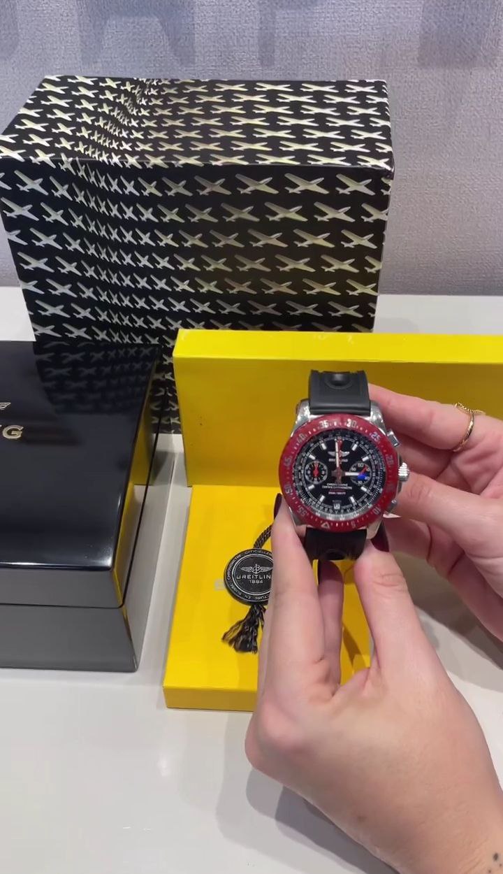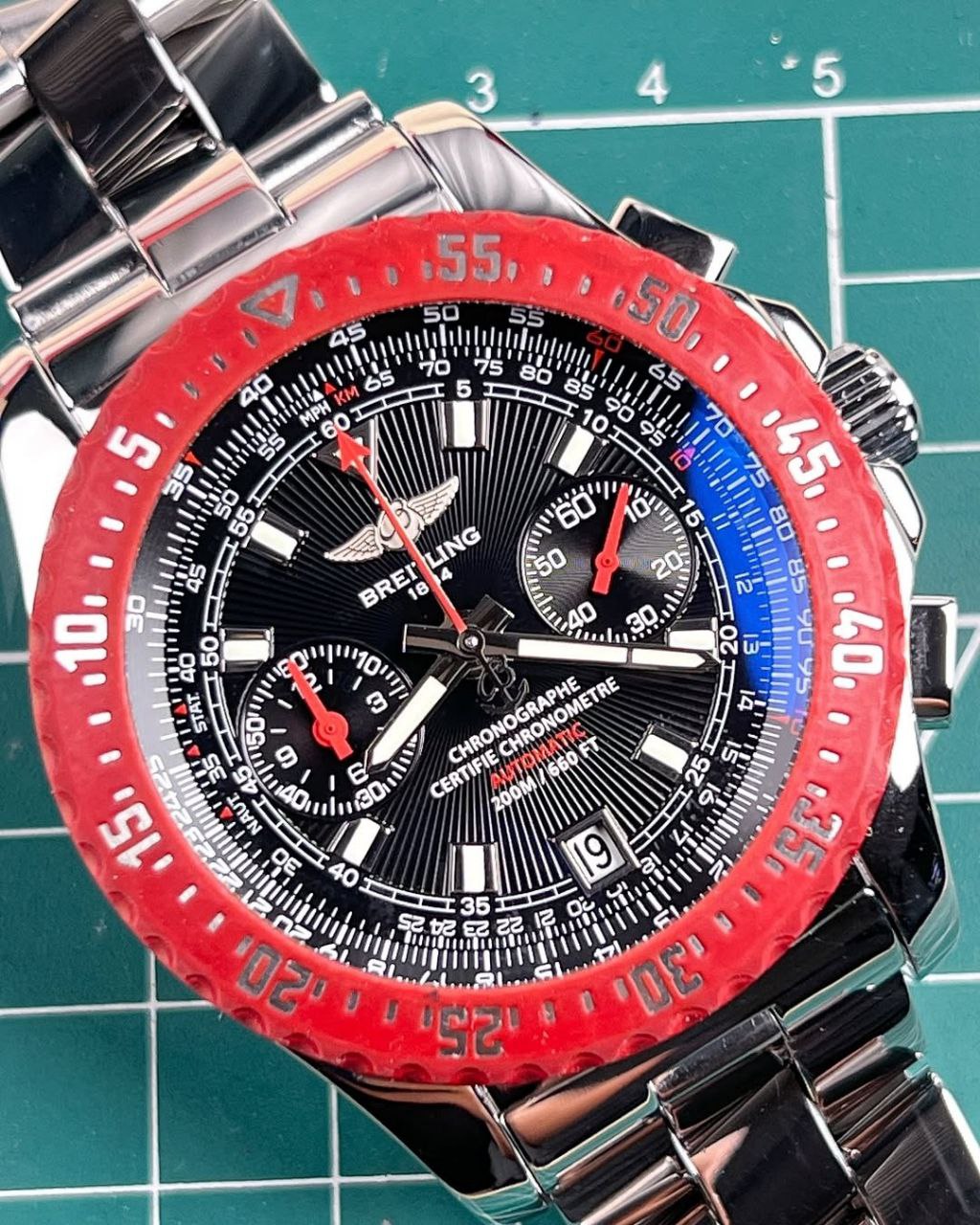 Discover this stunning Breitling Skyracer Raven A27363 red bezel chronograph — a bold member of Breitling’s Professional collection known for its aviation-inspired toughness and eye-catching design. This reference features the distinctive bi-directional rotating bezel in red and blue, paired with a robust stainless steel case and black structured dial, delivering the perfect blend of sporty performance and striking visual appeal that enthusiasts love.
