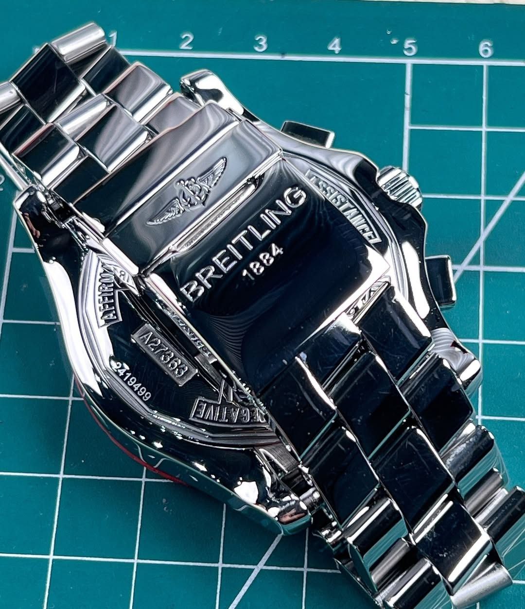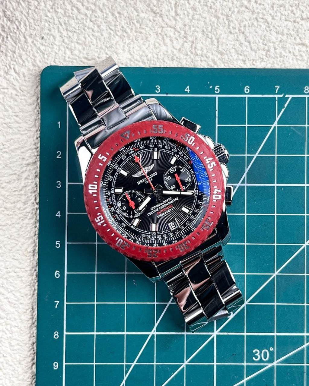 The Breitling Skyracer Raven A27363 stands out with its red bezel. The bi-directional rotation allows quick timing adjustments, while the red/blue color scheme adds a dynamic, high-contrast look. The black structured dial provides excellent readability with luminous hands and markers that glow brightly in low light. The 43.5–45mm stainless steel case wears substantial yet balanced. It suits pilots, motorsport fans, or anyone who appreciates Breitling’s tool-watch DNA. Powered by the automatic Breitling Caliber 27 movement, this Skyracer Raven chronograph delivers reliable precision. It offers a solid power reserve and smooth chronograph operation with sub-dials for minutes, hours, and running seconds.