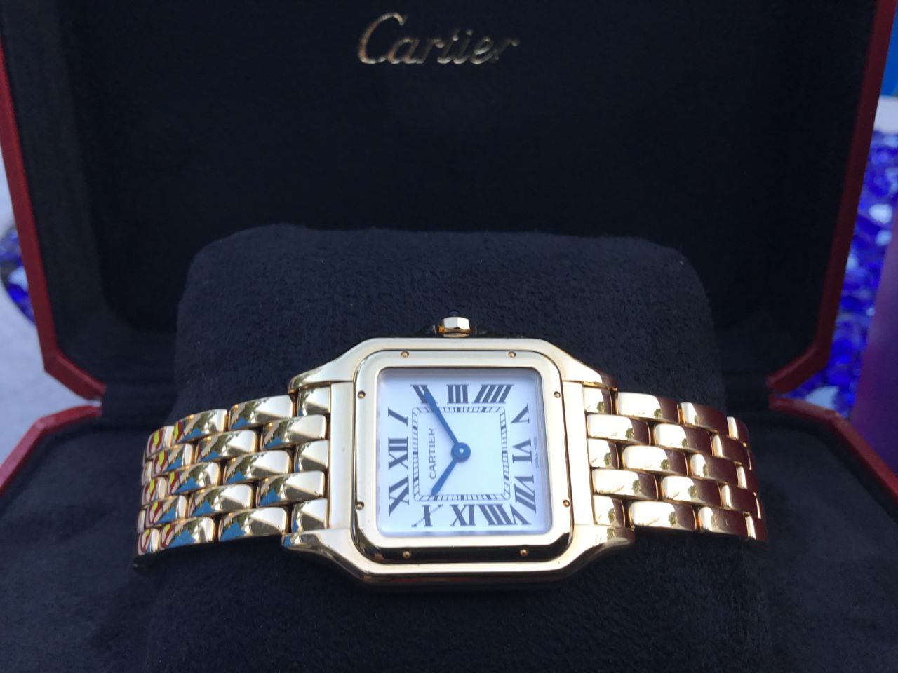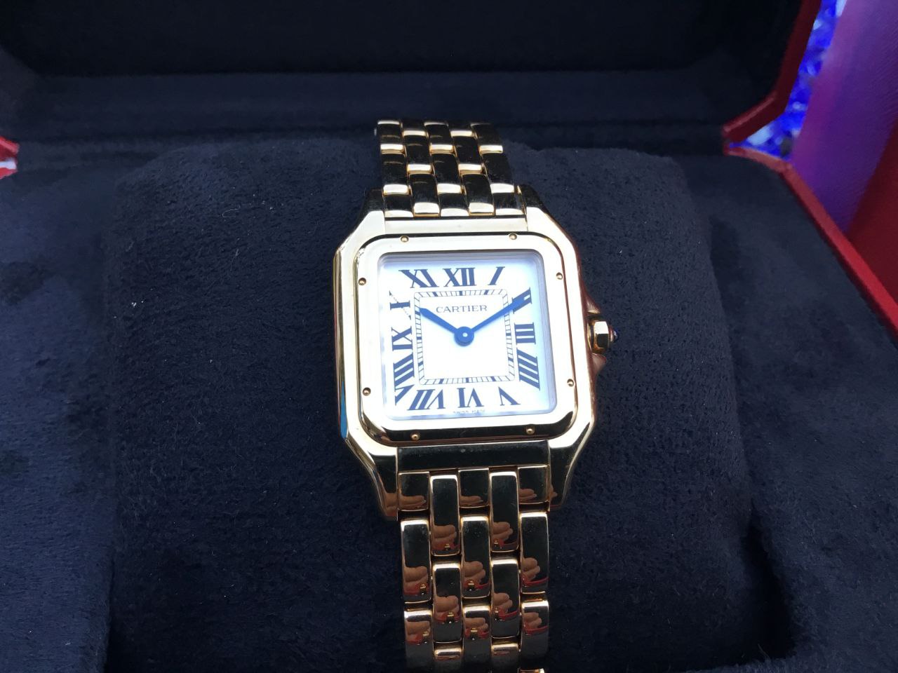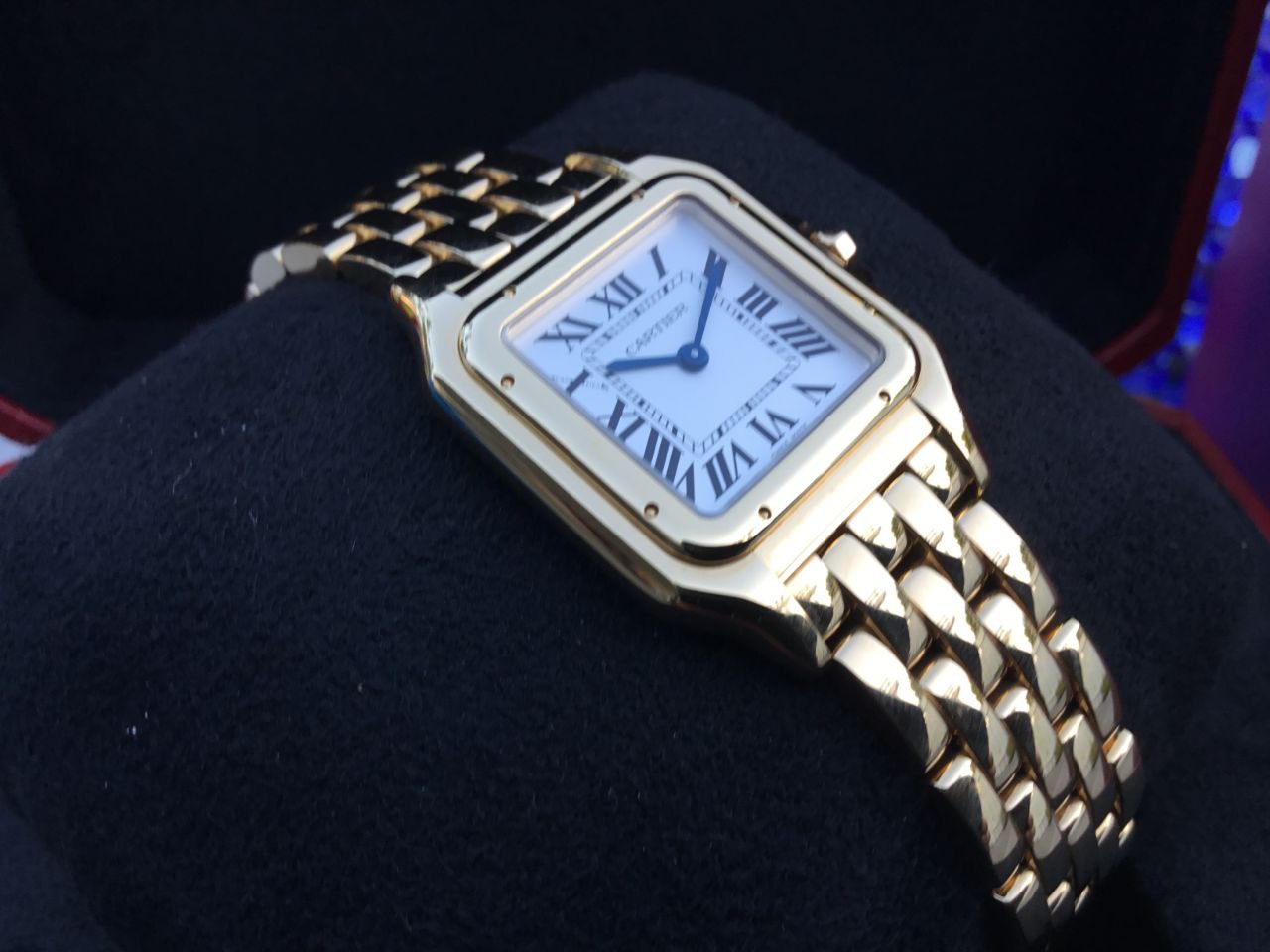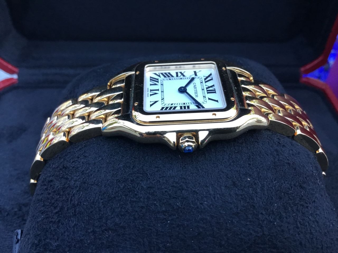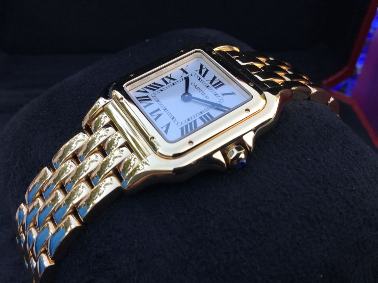 The Cartier Panthère Medium WGPN0045 captivates with its silvered white dial. The clean, luminous surface glows softly under light, perfectly framed by the polished 18k yellow gold case and accented by bold Roman numerals. Blued-steel sword hands add signature Cartier refinement and legibility. The 36.5mm x 26.7mm case (6.4mm thick) wears beautifully balanced on the wrist. It feels luxurious yet lightweight, versatile for everyday sophistication or evening glamour. Powered by a reliable quartz movement, this Panthère keeps precise time with no winding required. The octagonal crown set with a blue sapphire cabochon adds a touch of iconic Cartier detail. Water resistance stands at 30 meters for everyday confidence.