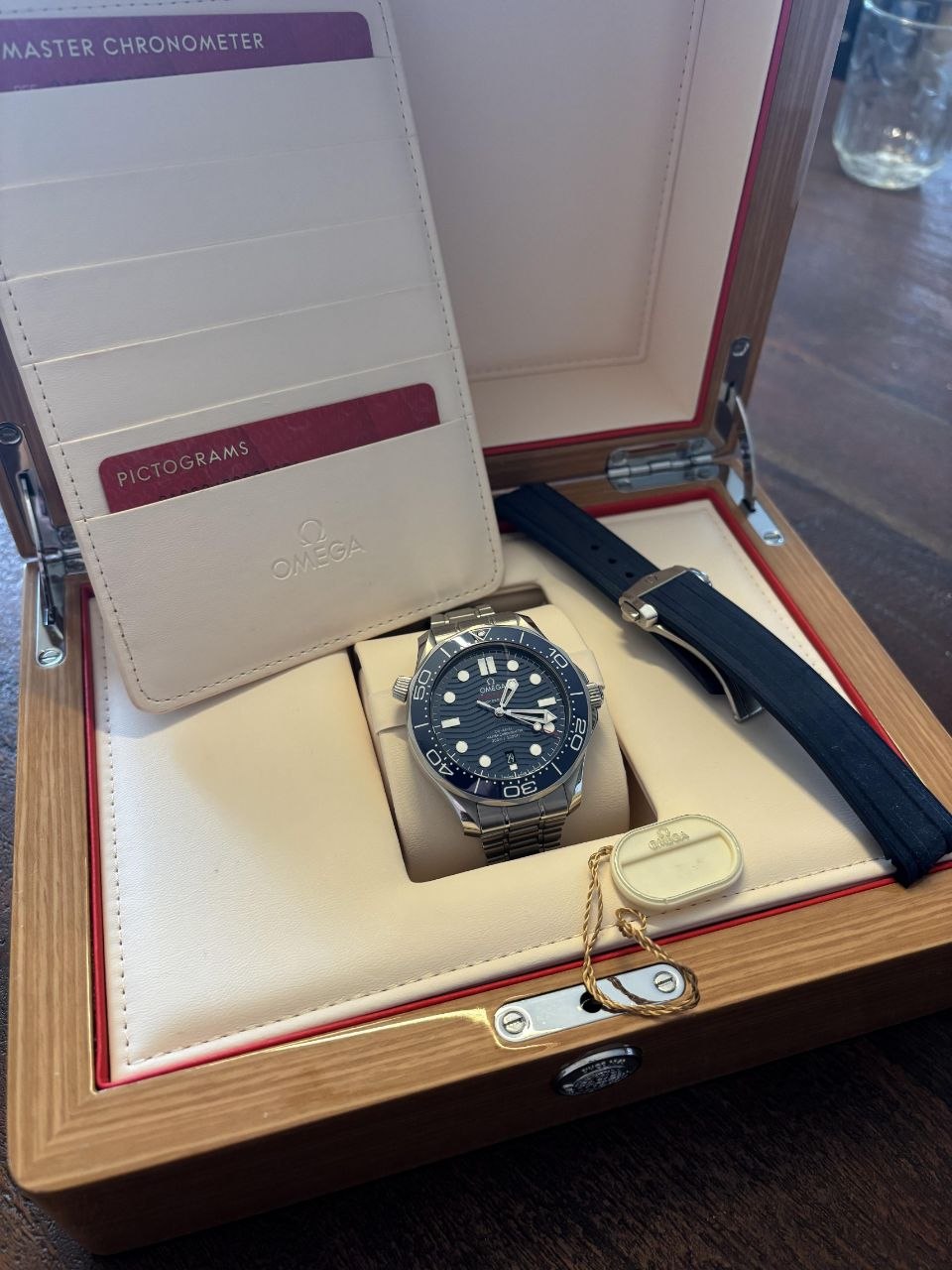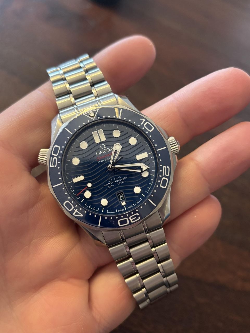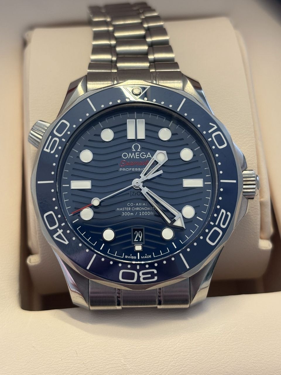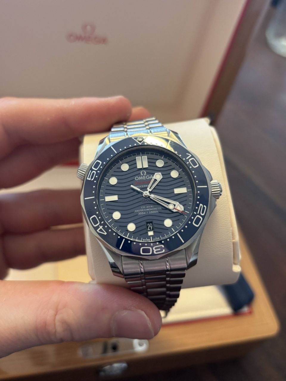 This Omega Seamaster Professional 210.32.42.20.03.001 Blue Wave Dial is from 2022 and comes as a full set with boxes and papers. The watch is in excellent condition — case and bracelet are very clean, bezel and crystal are pristine, and there are no major dings or scratches visible. The movement runs strongly and keeps excellent time. The stainless steel bracelet is fully linked and includes the original rubber deployant strap as well.