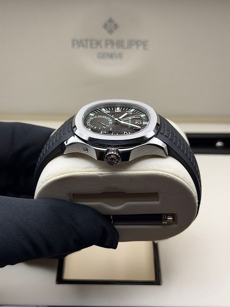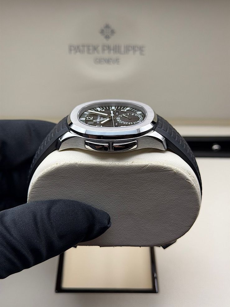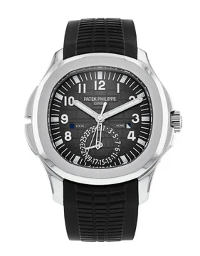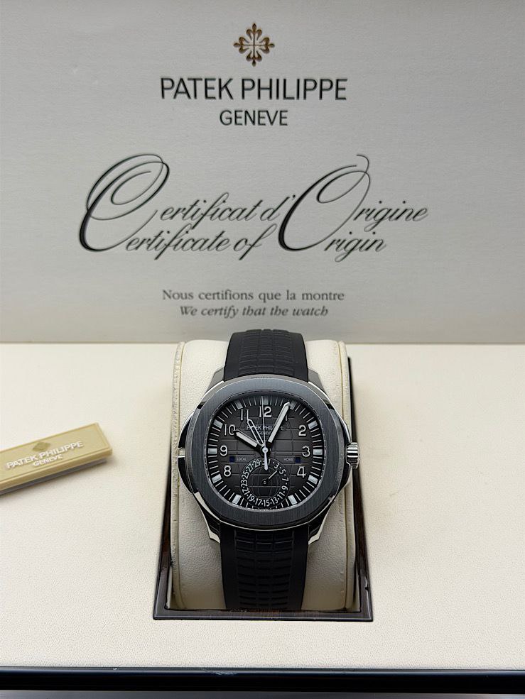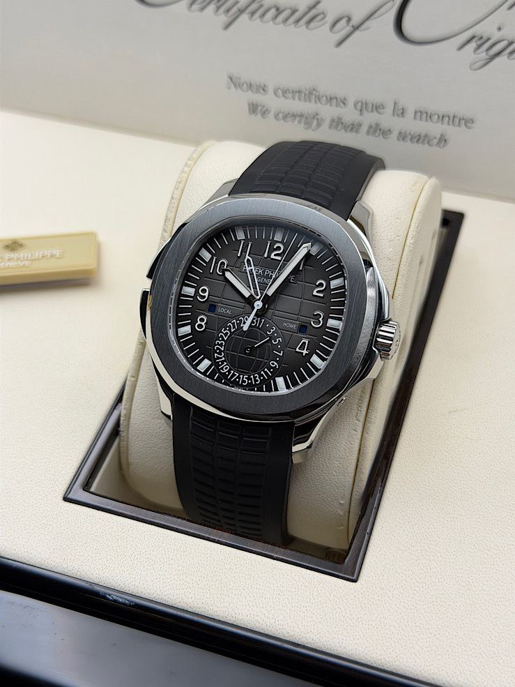 Discover this stunning Patek Philippe Aquanaut 5164A Black Tropical Dial Rubber Strap — the highly sought-after 2015 Travel Time reference in stainless steel with the iconic black “tropical” dial. This dual-time masterpiece features the signature embossed Aquanaut dial pattern, luminous baton markers, and the signature porthole case, blending sporty elegance with Patek Philippe’s legendary finishing and functionality for the discerning traveler or collector.