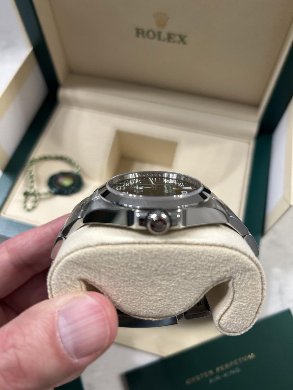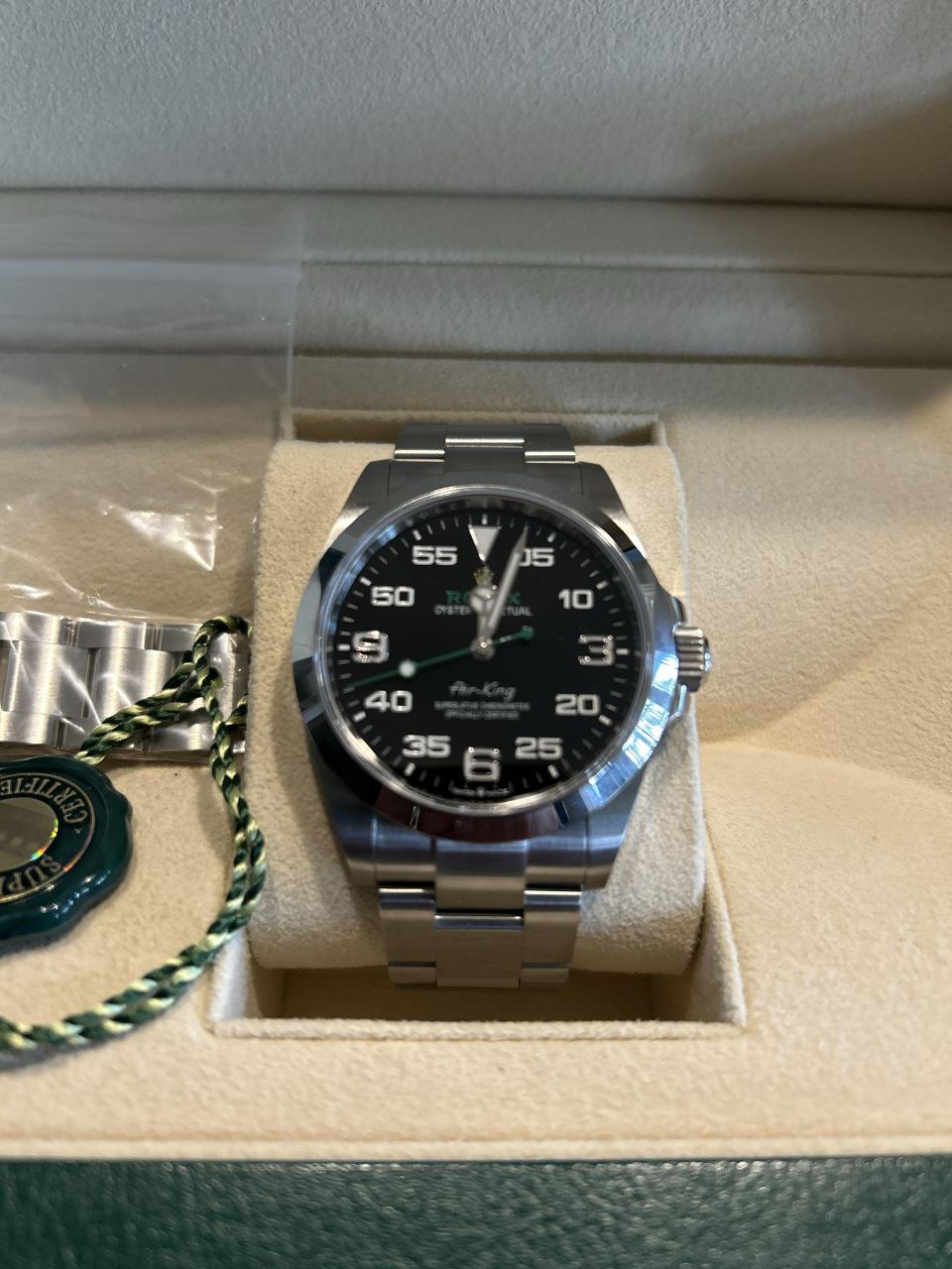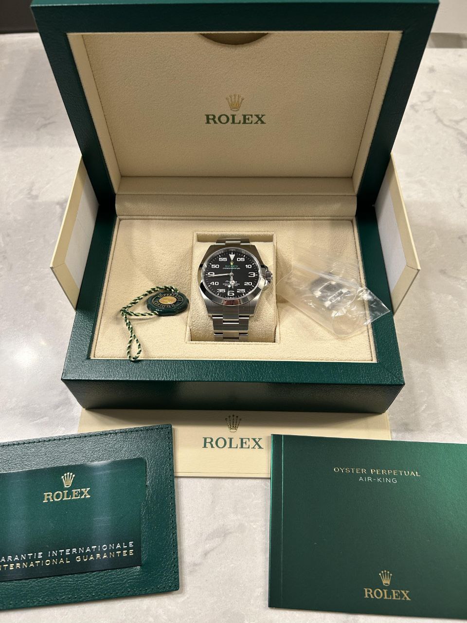 This Rolex Air-King 126900 remains in MINT condition. Unworn or barely worn, no scratches, dents, bracelet stretch, or signs of use. Full set includes inner and outer boxes, warranty card (recent date for fresh provenance), green and white hang tags, manuals, booklet, and card holder.