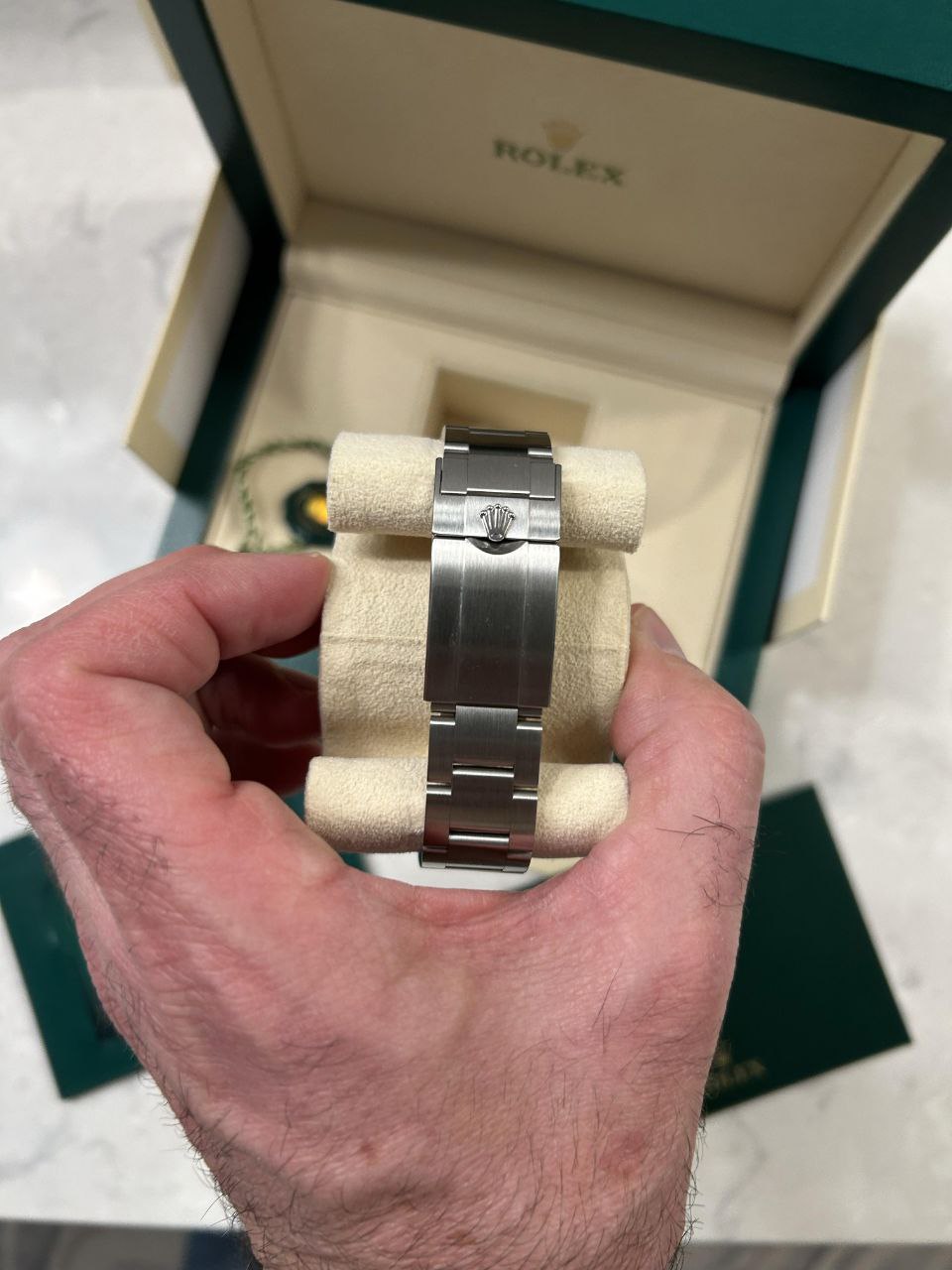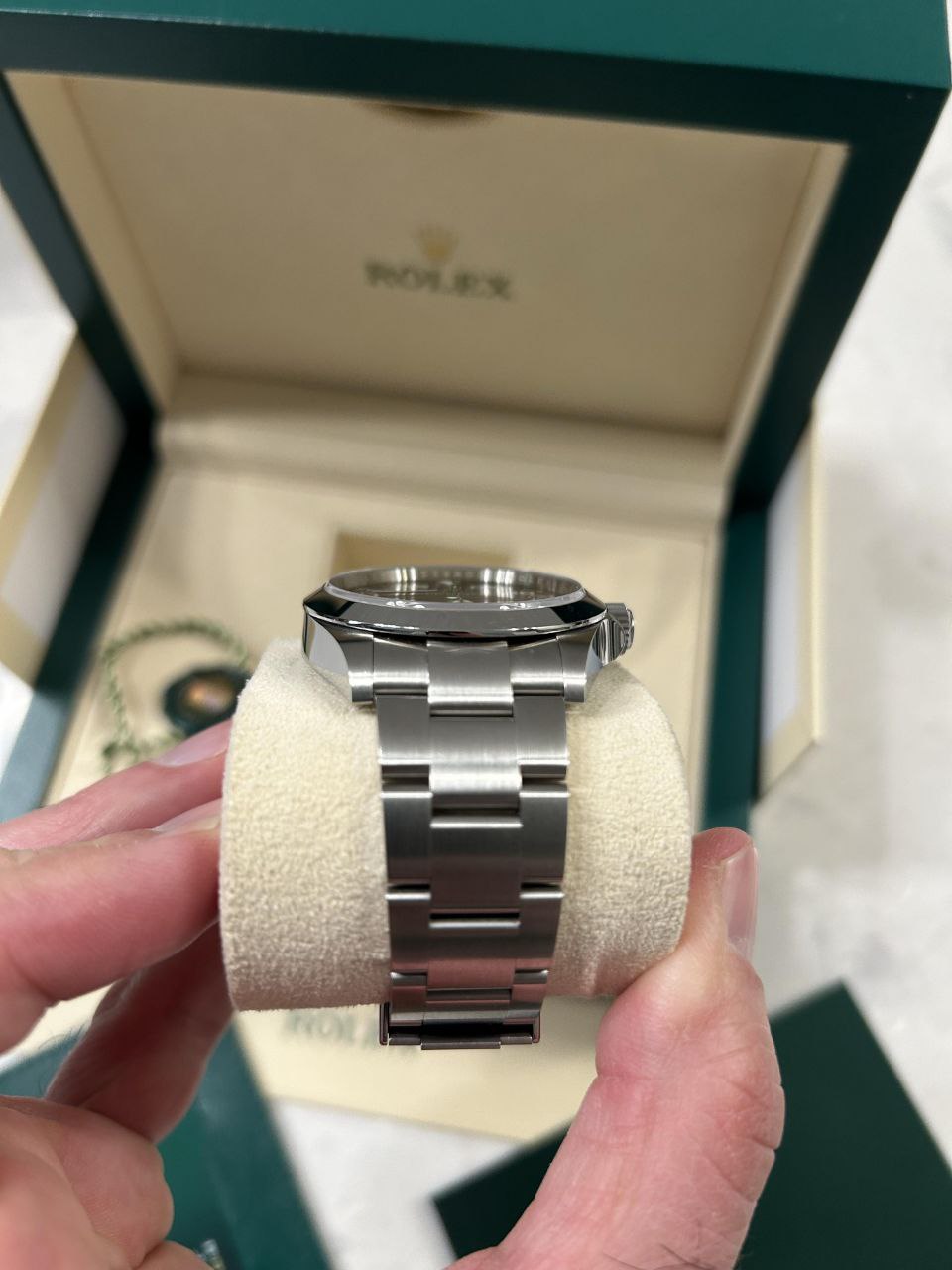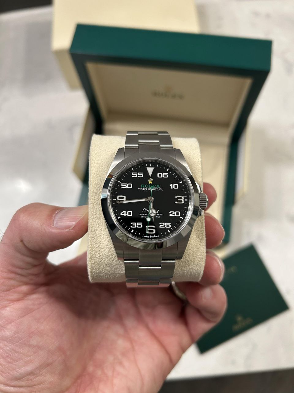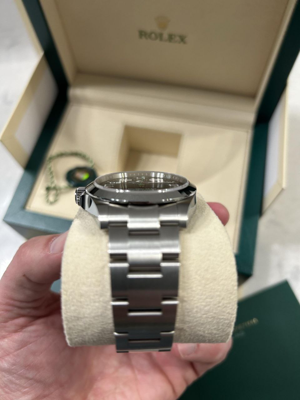 This Rolex Air-King 126900 remains in MINT condition. Unworn or barely worn, no scratches, dents, bracelet stretch, or signs of use. Full set includes inner and outer boxes, warranty card (recent date for fresh provenance), green and white hang tags, manuals, booklet, and card holder.