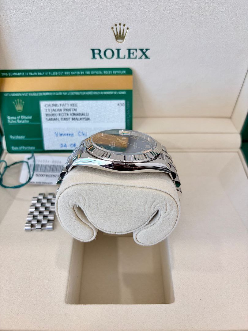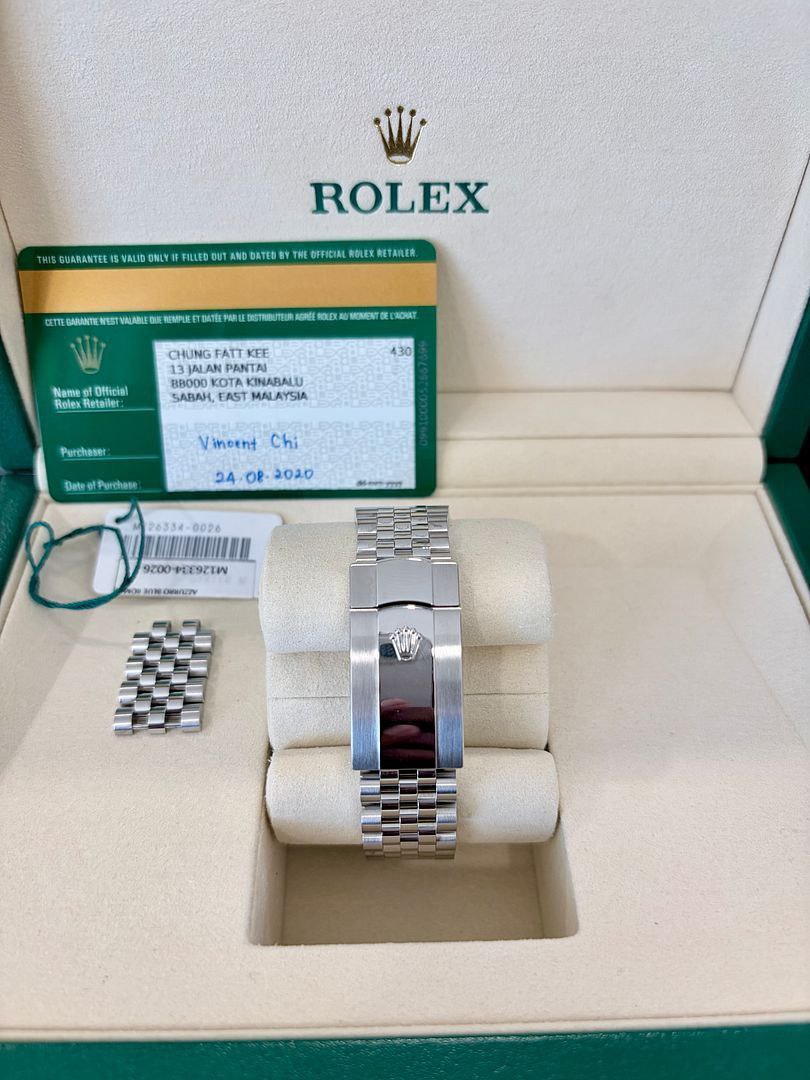This Rolex Datejust 126334 is in like new, mint condition. The crystal remains clear with no visible scratches. The Jubilee bracelet holds tight with minimal stretch. It includes the watch pouch, instruction manual, and warranty booklet. Warranty card dated 08/24/2020 confirms provenance. White serial tag present; green chronometer tag absent; no original box.