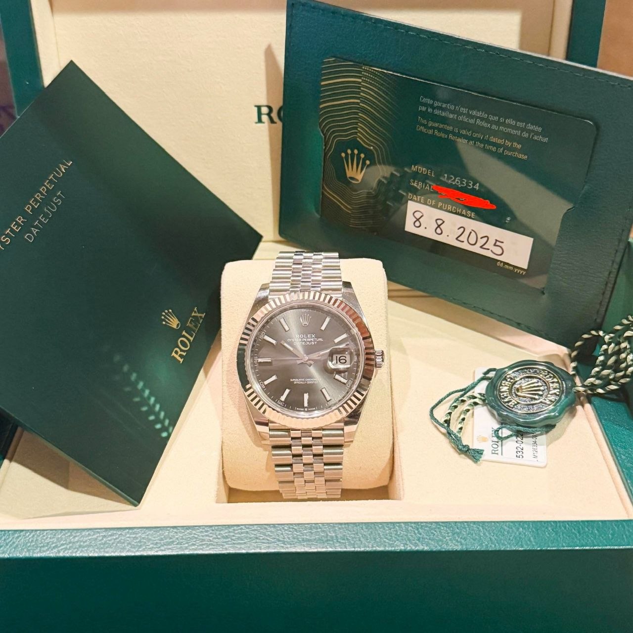 This full set Rolex Datejust 126334 from 2025 arrives in excellent condition. It includes the original box, warranty card, booklets, tags, and all accessories as issued. The watch remains pristine with no visible wear.