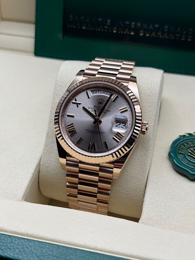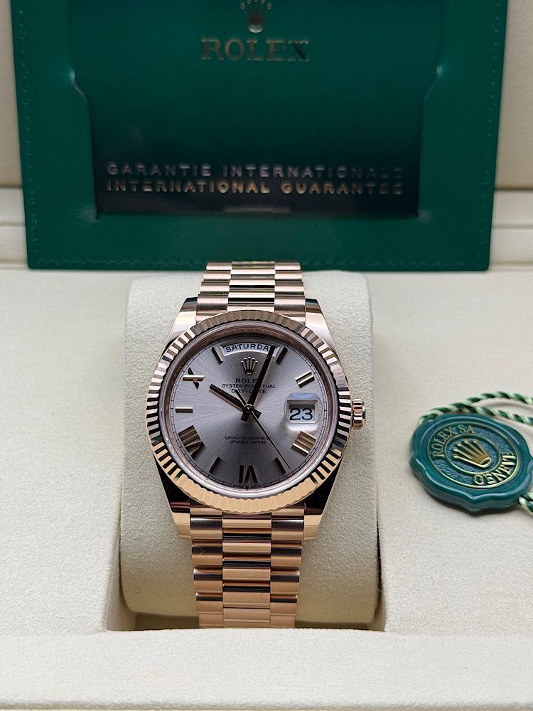 This warm sundust Rolex Day-Date 228235 Everose gold 40mm 2025 combines modern freshness with classic Day-Date heritage. Collectors prize its pristine unworn status, full set completeness, and strong investment potential. We guarantee 100% authenticity through expert inspection.