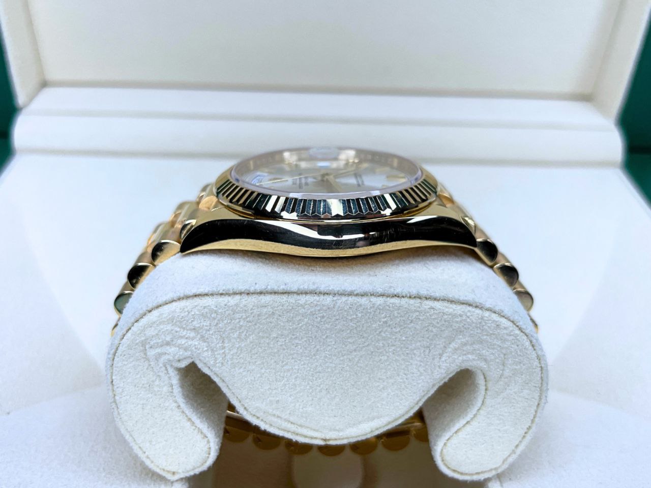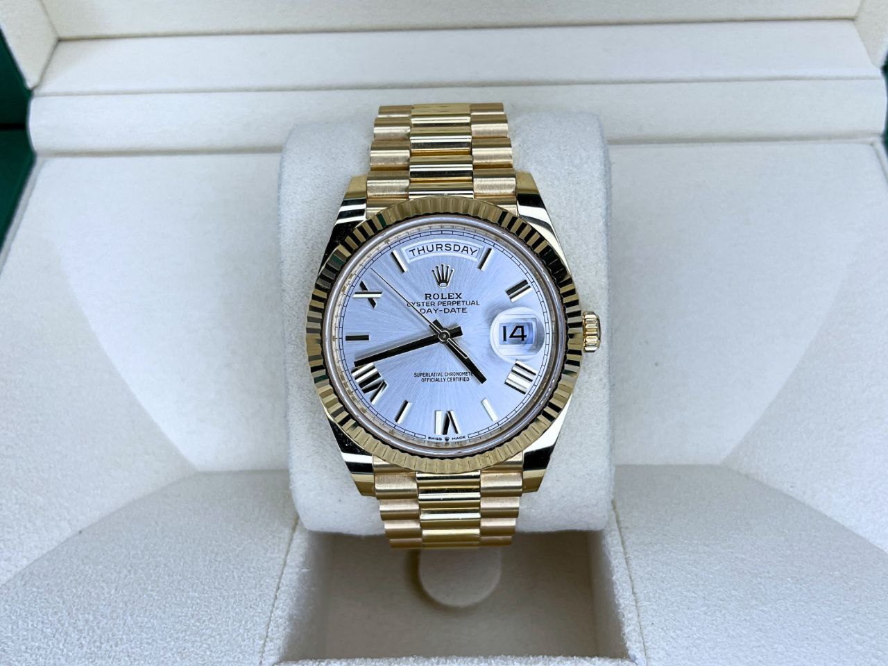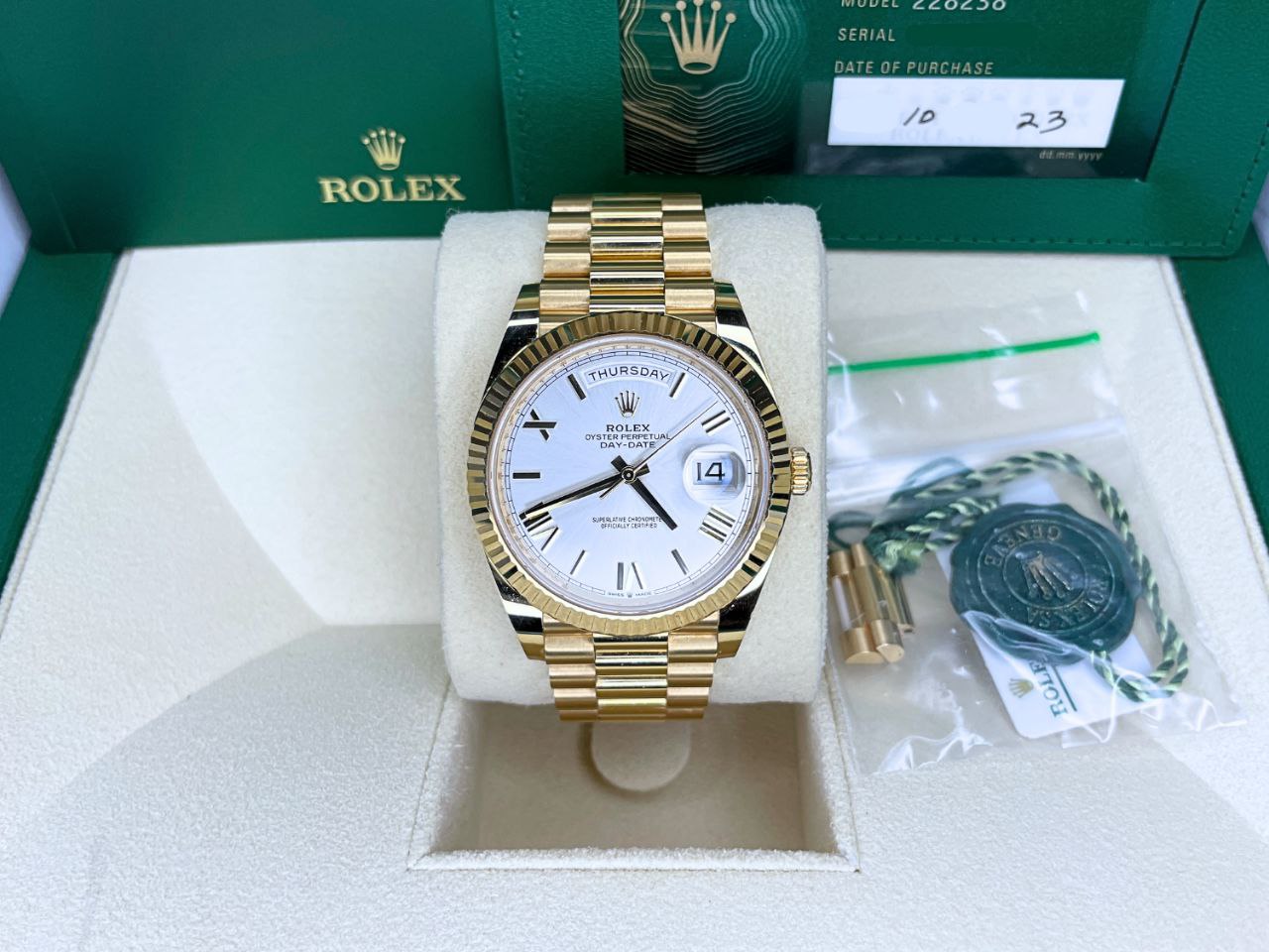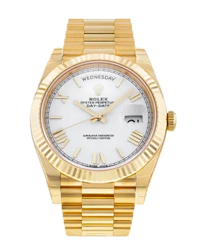 The Rolex Day-Date 228238 glows beautifully in any light. Its silver dial offers a versatile, understated backdrop for the iconic day window at 12 o’clock. The 40mm yellow gold President wears with commanding presence. It suits boardrooms, formal events, or as a statement piece. Powered by the Caliber 3255 movement, this Rolex Day-Date 40mm President delivers exceptional precision. It holds a generous 70-hour power reserve. The Parachrom hairspring resists magnets. Chromalight hands and markers provide strong blue luminescence in low light. Water resistance reaches 100 meters with the Twinlock crown.