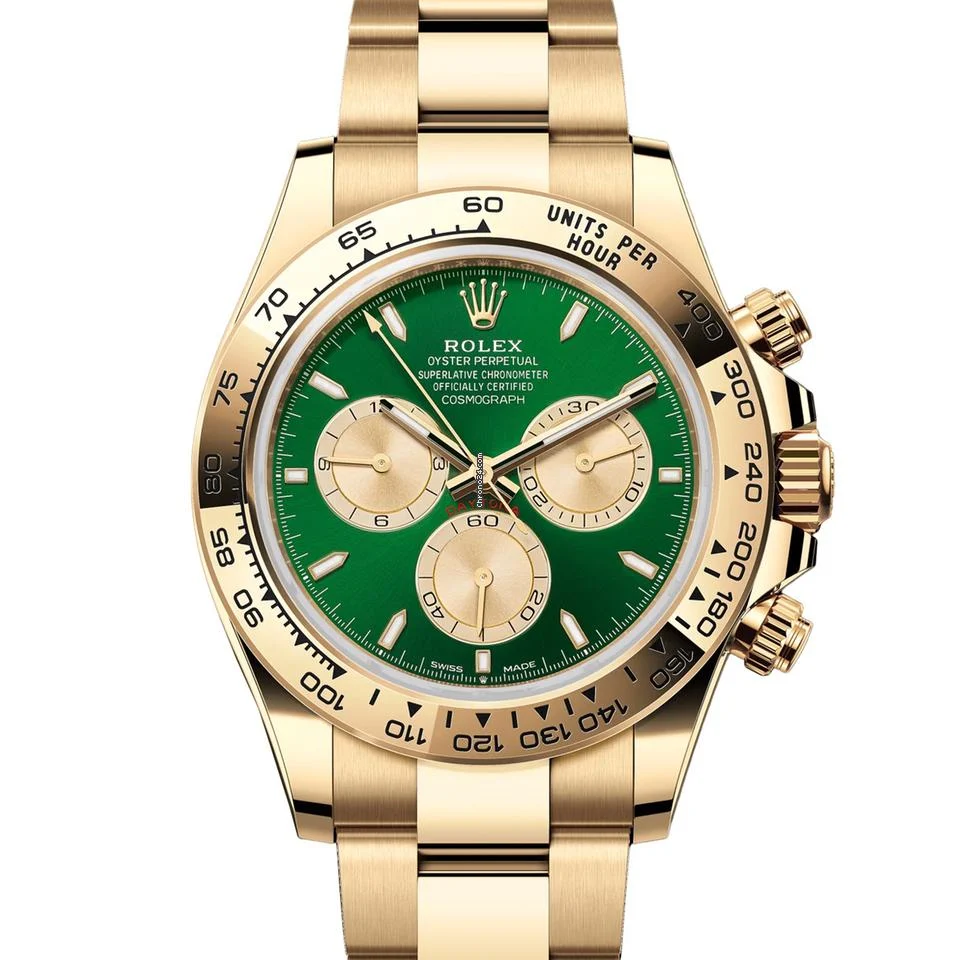 Discover this stunning Rolex Daytona 126508-0008 yellow gold green dial 2025 — the ultra-rare “John Mayer 2.0” in full 18k yellow gold with the exclusive vibrant green dial and matching Oyster bracelet. This 2025 production reference features the highly coveted green sunray dial with contrasting black subdials, applied baton markers, and fixed yellow gold tachymeter bezel, delivering one of the most desirable and instantly recognizable gold Daytonas ever released — a bold modern evolution of the legendary Paul Newman-inspired aesthetic with striking color and timeless racing heritage.