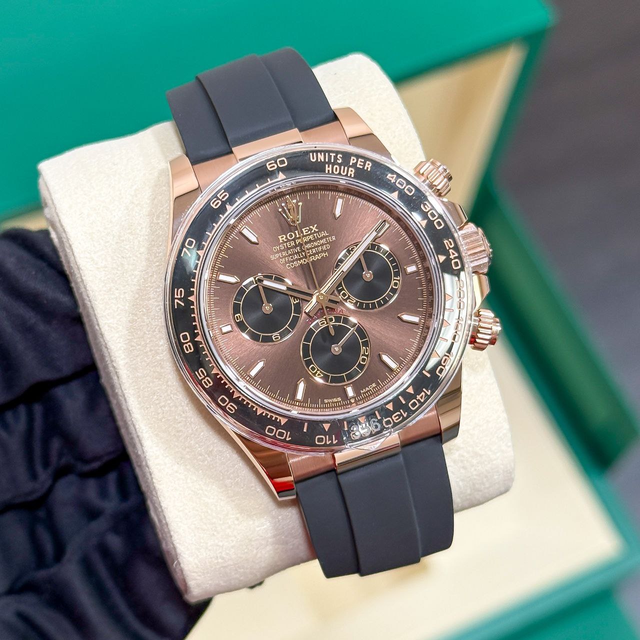 Discover this stunning Rolex Daytona 126515LN Chocolate Dial Everose Gold 2025 — the luxurious 18k Everose gold Cosmograph Daytona with the highly coveted chocolate brown dial and sporty Oysterflex bracelet. This October 2025 production reference (126515LN-0009 / 126515LN-0010) features the rich chocolate sunray dial with contrasting silver subdials, applied baton markers, and fixed Everose gold tachymeter bezel, delivering one of the most elegant and desirable gold Daytonas in recent years — perfect for collectors seeking warmth, rarity, and timeless racing heritage.