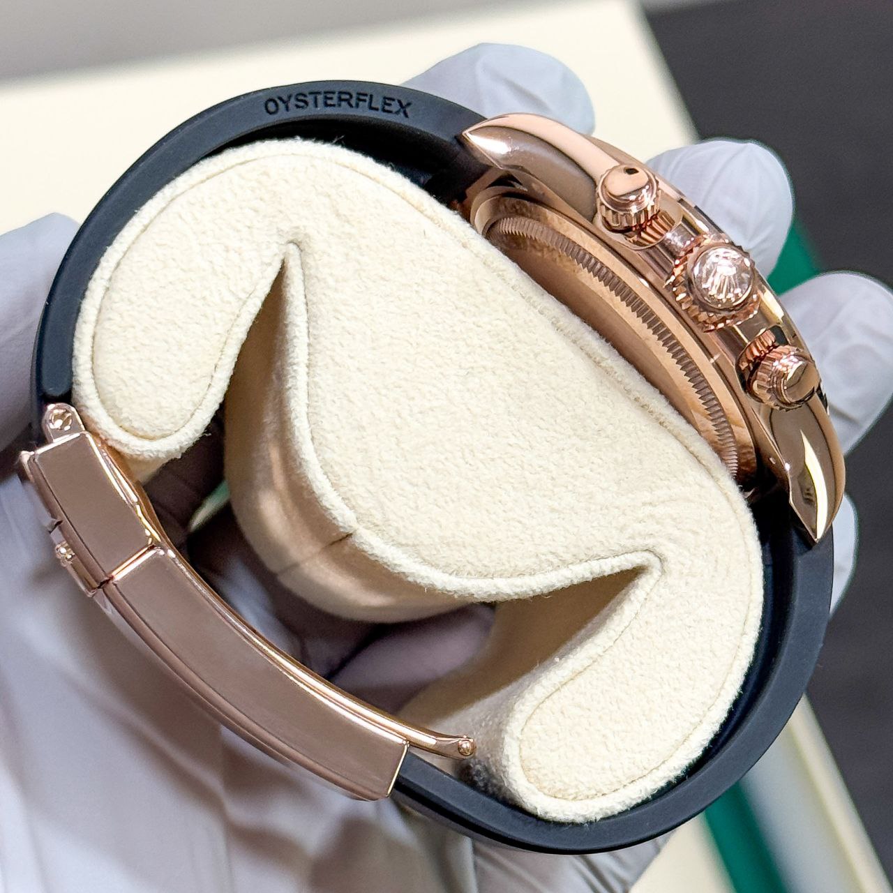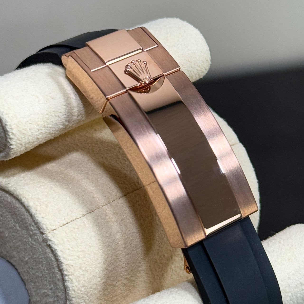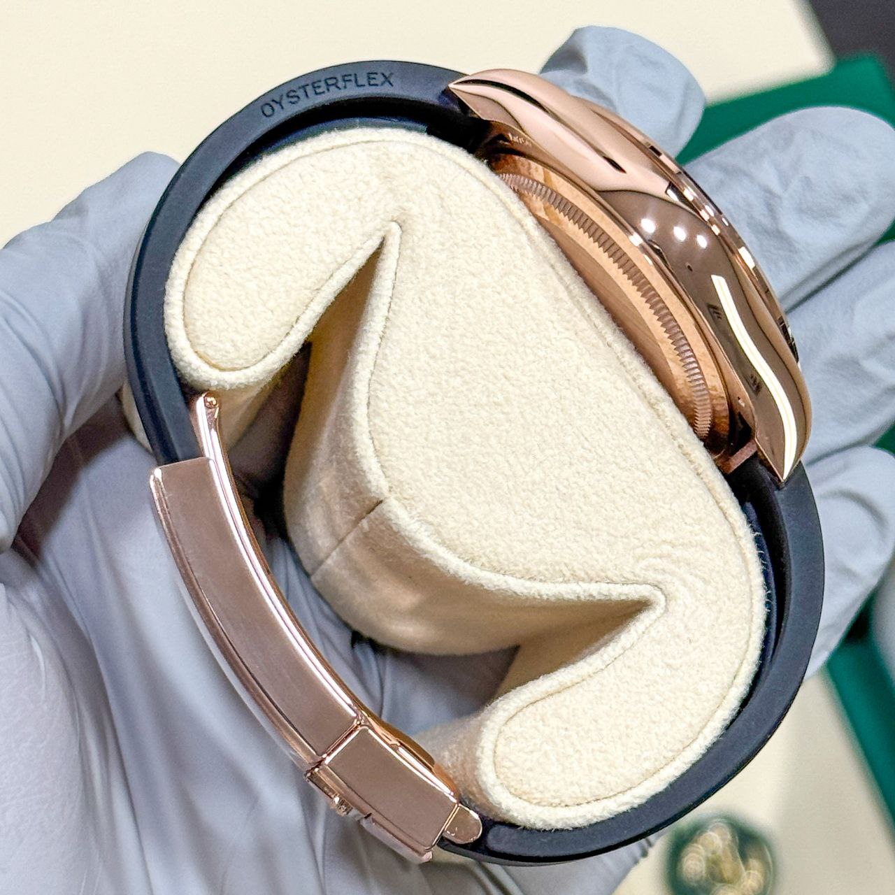 - Bracelet: Oysterflex rubber with 18k Everose gold Glidelock folding clasp (sizes E & F, fully adjustable)
