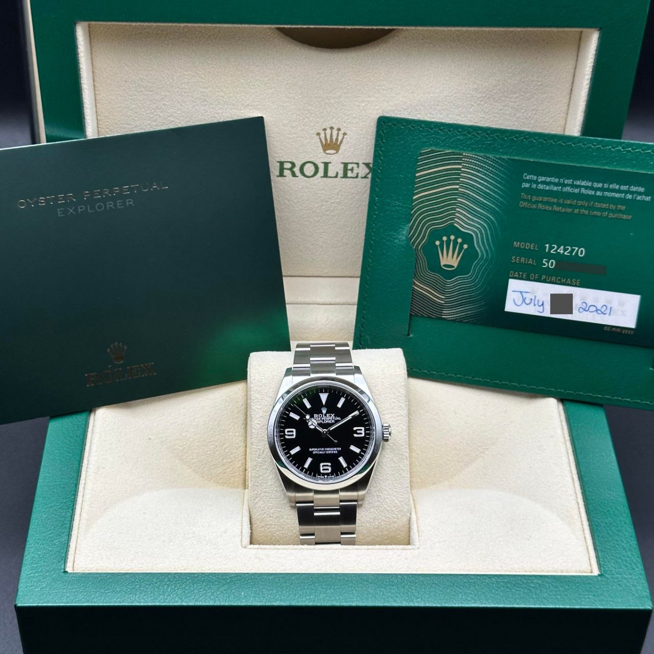 Includes inner/outer box, sleeve, warranty card dated 2021, wallet, booklet, and watch with 11.5 links (full sizing options). This 2021 Rolex Explorer 124270 remains in excellent condition with strong provenance.