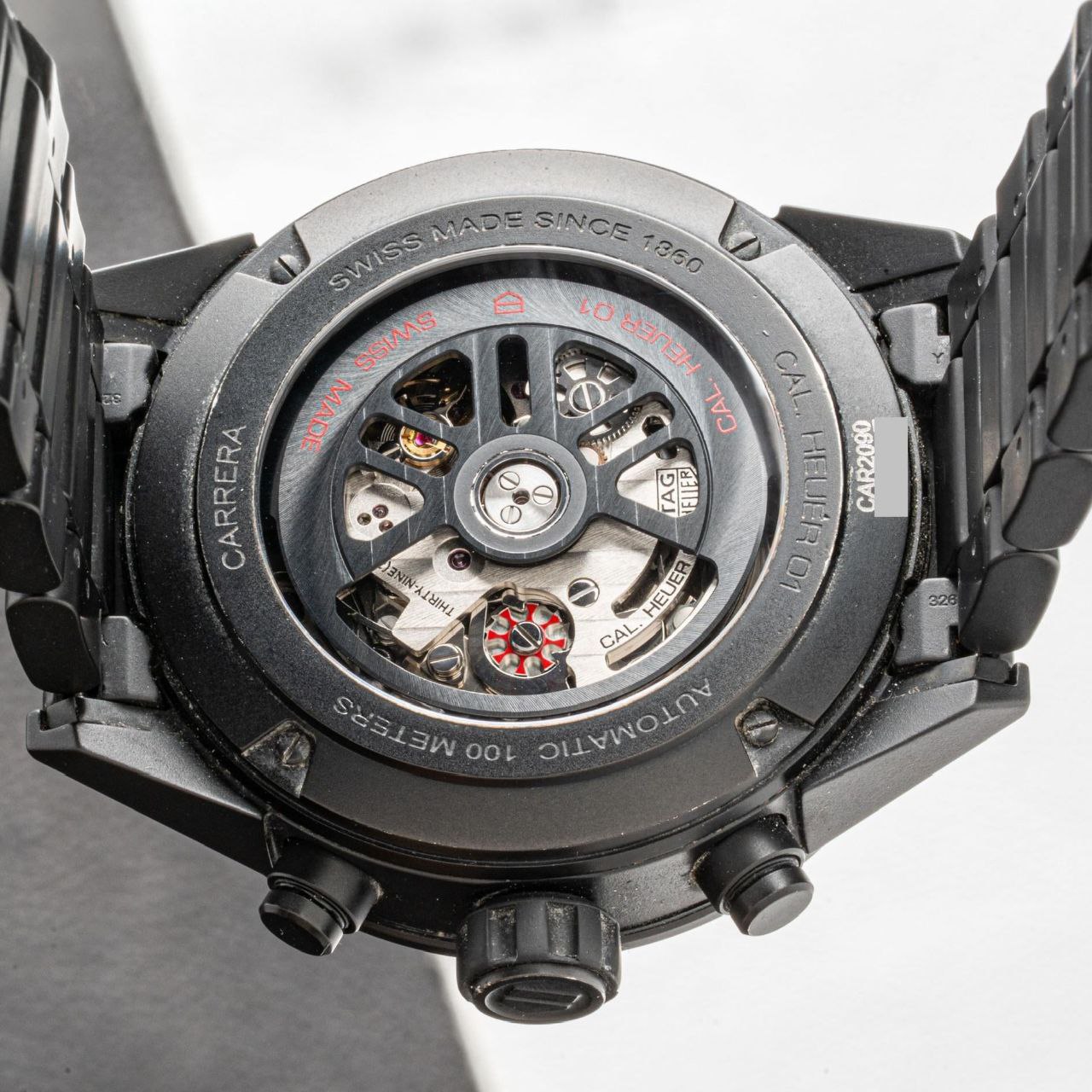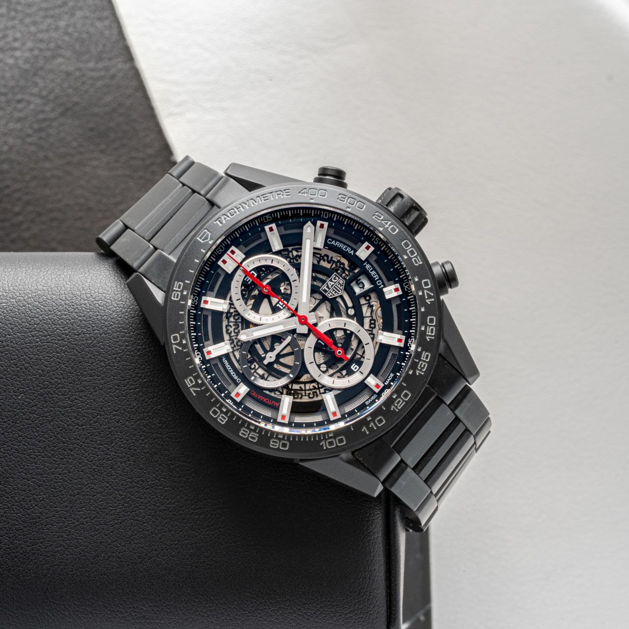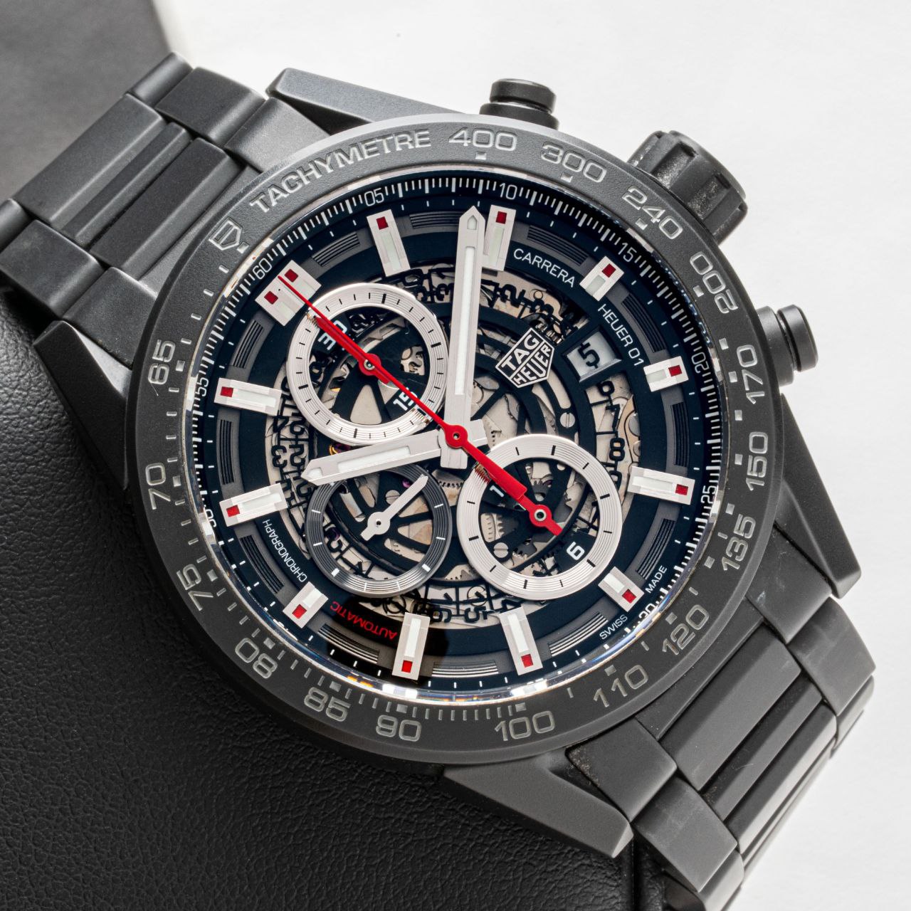 - Dial: Fully skeletonized with exposed Caliber Heuer 02, red chronograph accents