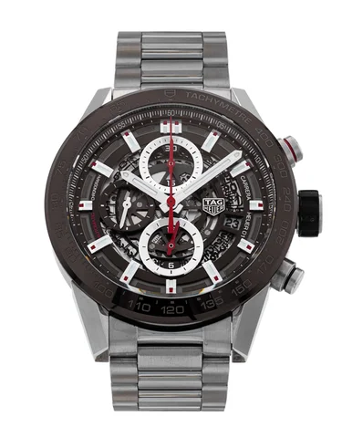 This TAG Heuer Carrera Chronograph captivates with its blue skeleton dial. Exposed movement components rotate openly under sapphire crystal, revealing the column-wheel chronograph and intricate finishing. Red chronograph hands and accents add racing energy, while luminous markers ensure legibility in low light. The 45mm case wears with commanding presence. It suits bold personalities, motorsport enthusiasts, or anyone who appreciates visible mechanics and TAG Heuer heritage. Powered by the in-house Caliber Heuer 02 automatic chronograph movement, this TAG Heuer Carrera delivers reliable performance. It offers a 75-hour power reserve and smooth operation.