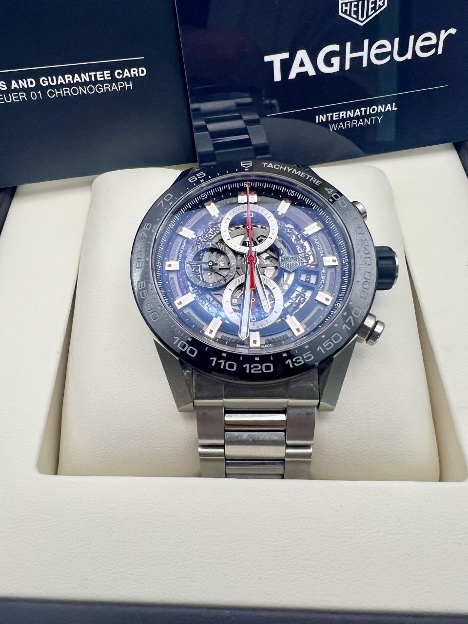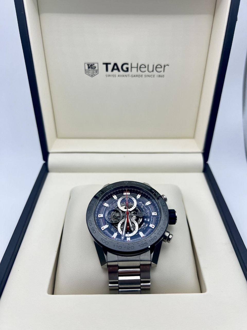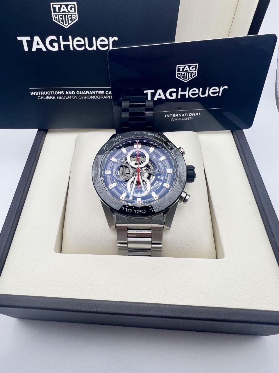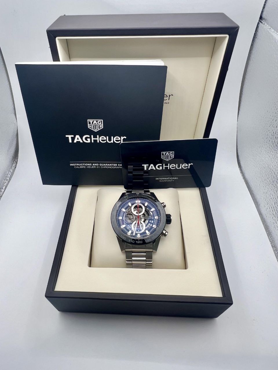 - Dial: Blue skeletonized with exposed Caliber Heuer 02, red chronograph accents
