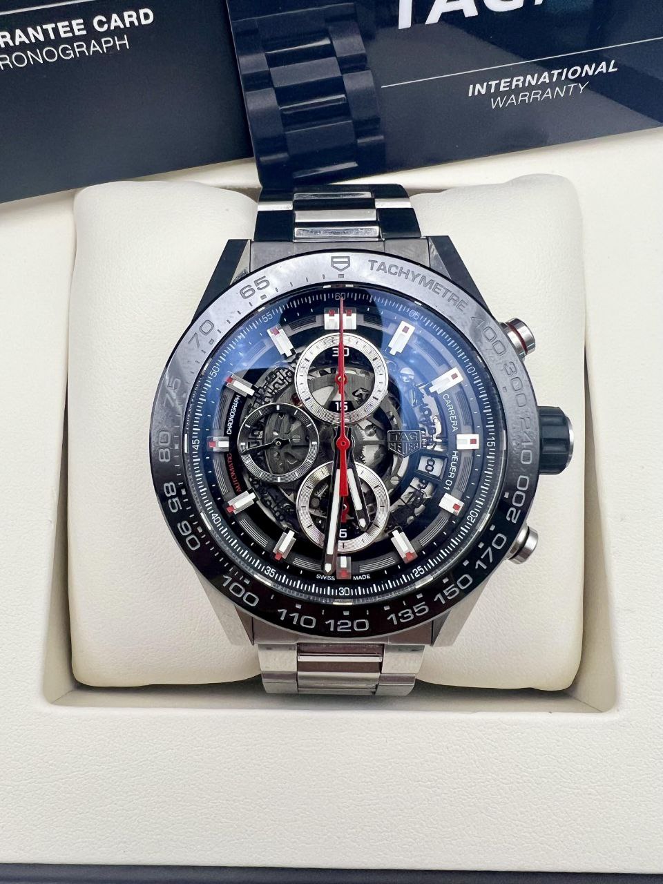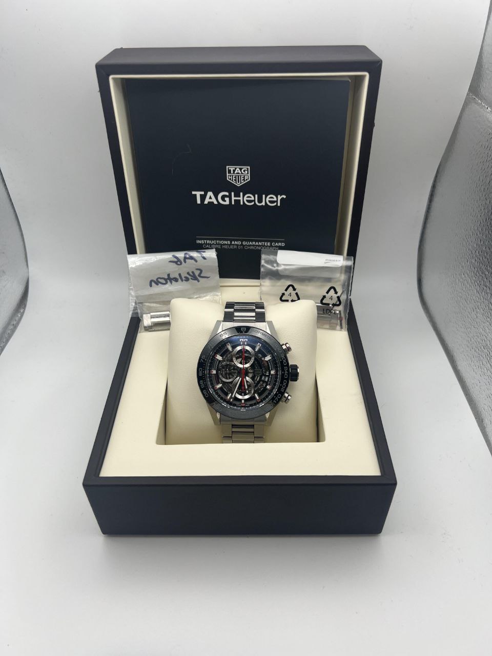This TAG Heuer Carrera Chronograph CAR2A1W 45mm is in very minor wear condition. Bezel, crystal, bracelet, and clasp all remain in great condition — no major scratches, dents, or heavy polishing visible. Light handling marks consistent with careful use. See pics for more accurate details. Mechanically perfect, running strong and accurate. Serviced by TAG Heuer in 2020 with receipt included.