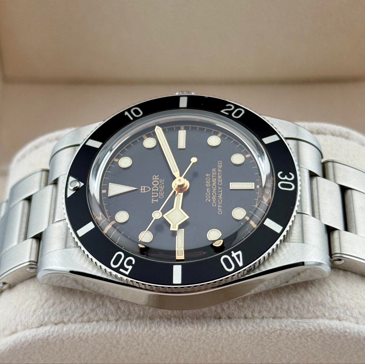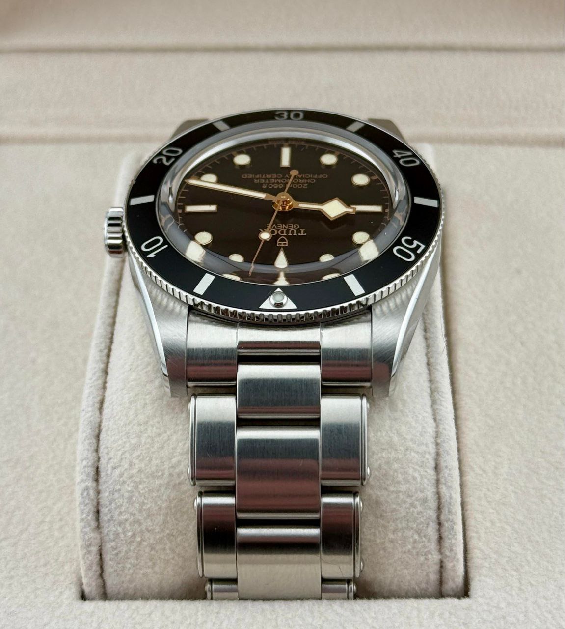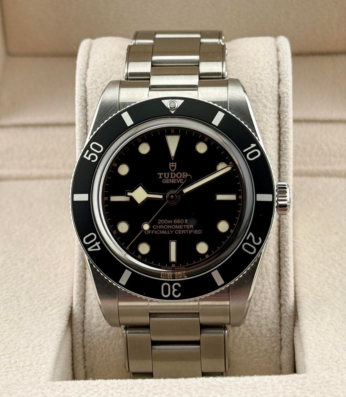 This Tudor Black Bay 54 M79000N-0001 is in excellent condition — the case is pristine with almost no signs of wear, bracelet and clasp show only a few light marks consistent with careful use. Bezel and crystal remain flawless. The watch is functioning as it should and keeping great time. Fully linked steel bracelet is unsized and strong.